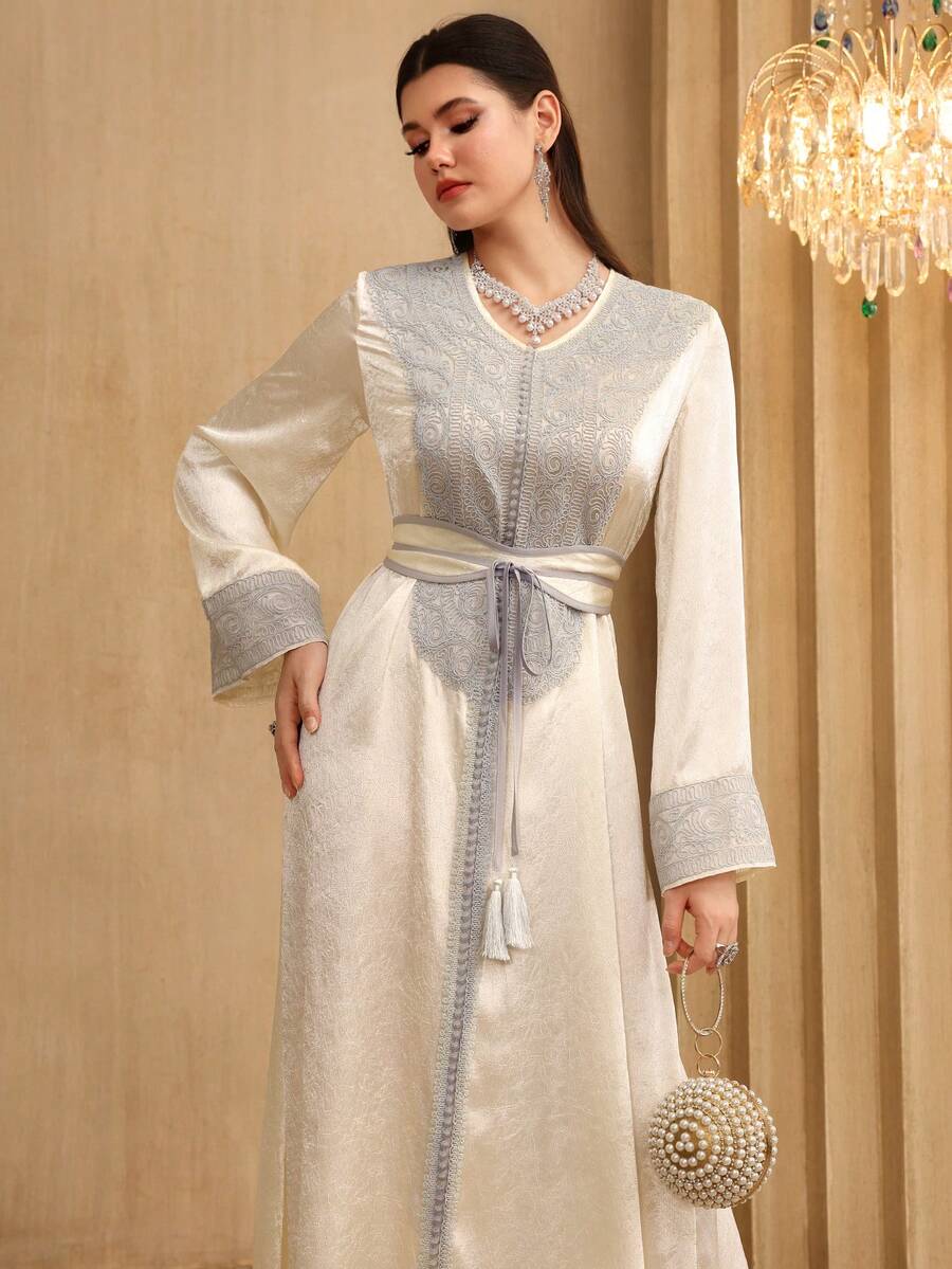 • Layrah Elegant Luxury Embroidered V-Neck Flare Sleeve Dress, Spring/Summer