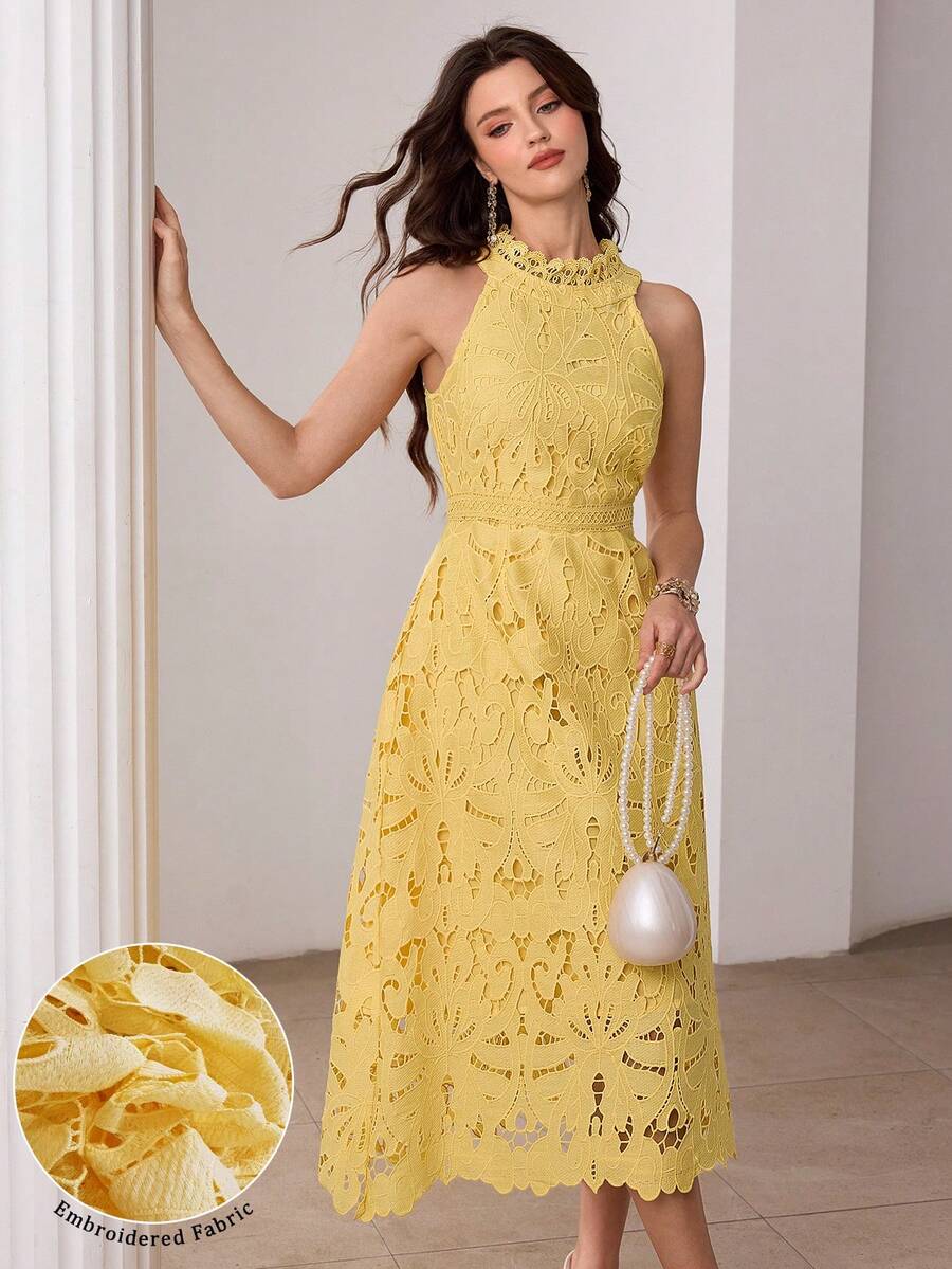 Modelyn Women's French Style Yellow Halter Neck Hollow Out Embroidery Sleeveless Casual Slim Dress