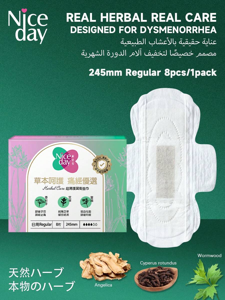 Niceday 8pcs/245mm Herbal Sanitary Napkins, Containing Mugwort, Cyperus, And Angelica, Suitable For Menstrual Pain, Organic Surface Layer, Non-Irritating, Breathable And Dry, High Absorbency, No Leakage