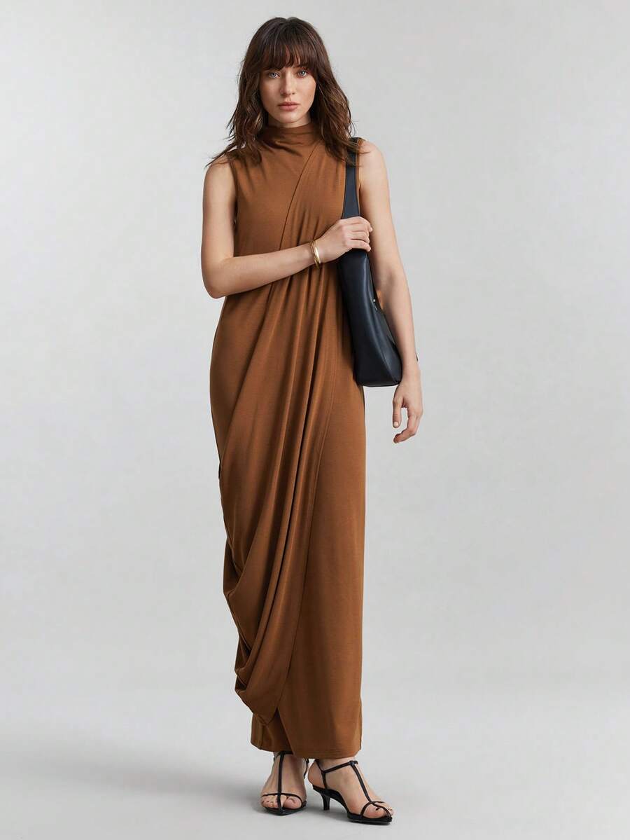 Ontre 2026SS Women's Red-Brown Faux Wool Blended High-Stretch Fabric Comfortable & Skin-Friendly Asymmetric O-Shaped Ruched Design 2 In 1 Mock Neck Straight Dress With Wrapped Ruched Decor, Modern Urban Casual Business Commuter High-Quality Airport Fashion Modern Urban Casual Fashion Business Casual Women's Office Wear Low-Key Old Money Style Effortless Temperament High-End Urban Commuting High-Quality Airport Women's Wear High-End Material