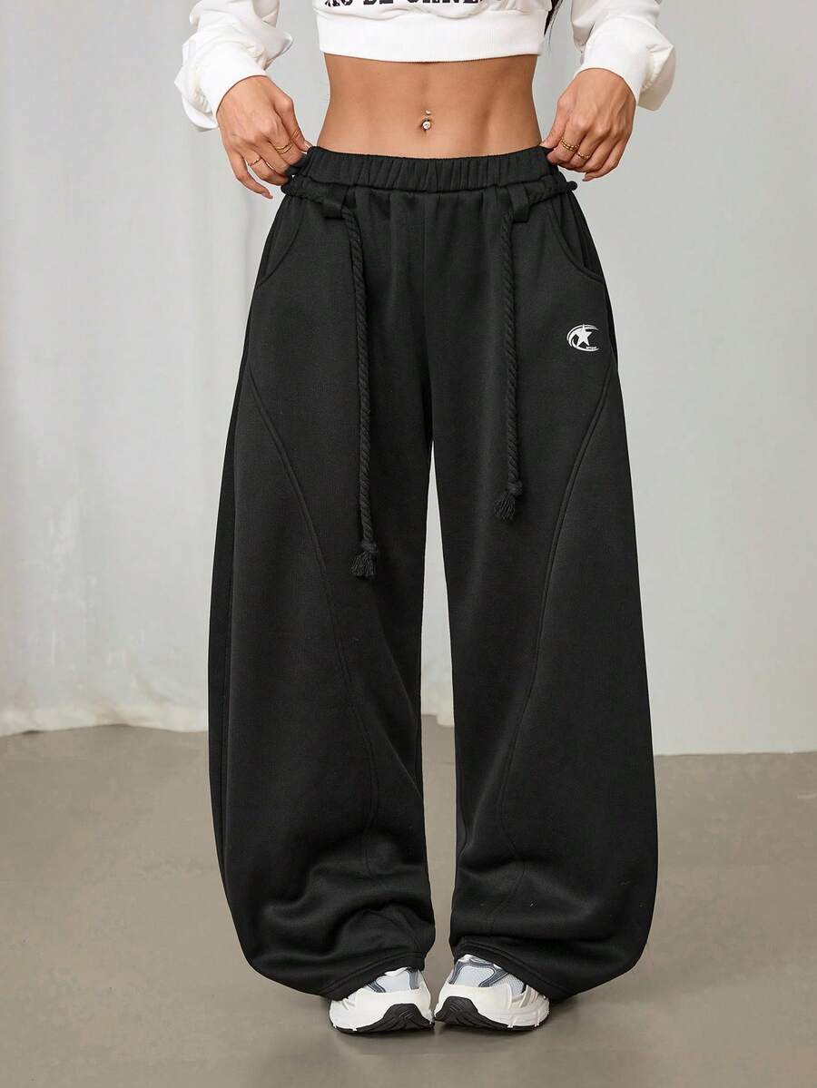 SHEIN PETITE Women's Fall/Winter Streetwear Back To School Preppy Casual Warm Comfortable French Black Elastic Waistband Curved Hem Pants,Black Pants
