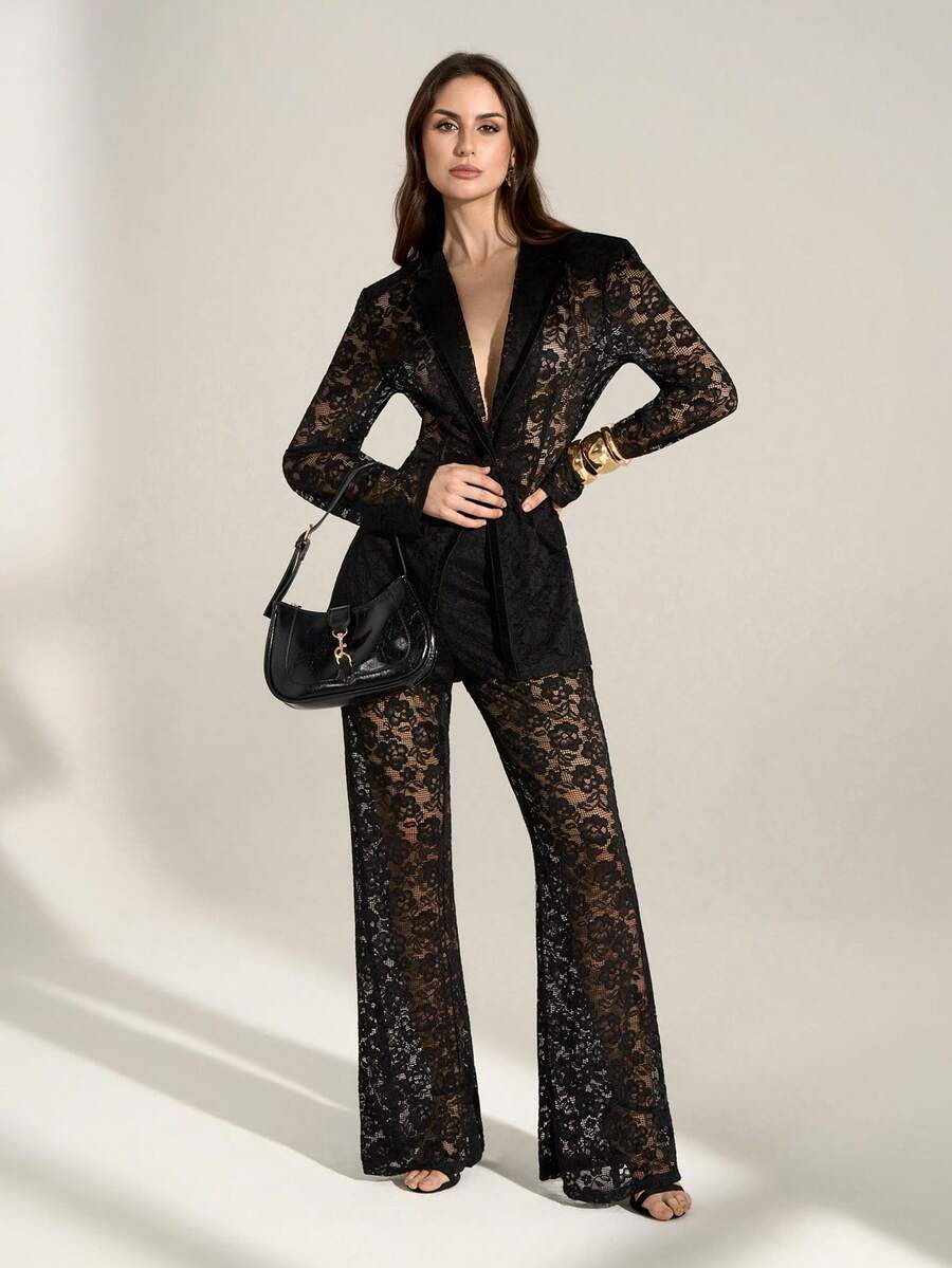 SHEIN Tall Fall Women's Clothing, Commuter Fashion, Fall Women's Clothing, Fall Essentials, Women's Lapel, Long-Sleeved Lace See-Through Slim Fit, Elegant Black Blazer, Women's Lace Jacket, Women's Black Blazer