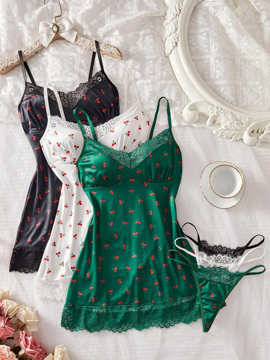 Sexy Lingerie, 3 Piecescombination Set For Women's Sexy Nightgown, Pajama Nightgown Lingerie Set, Cherry Print Lace Design