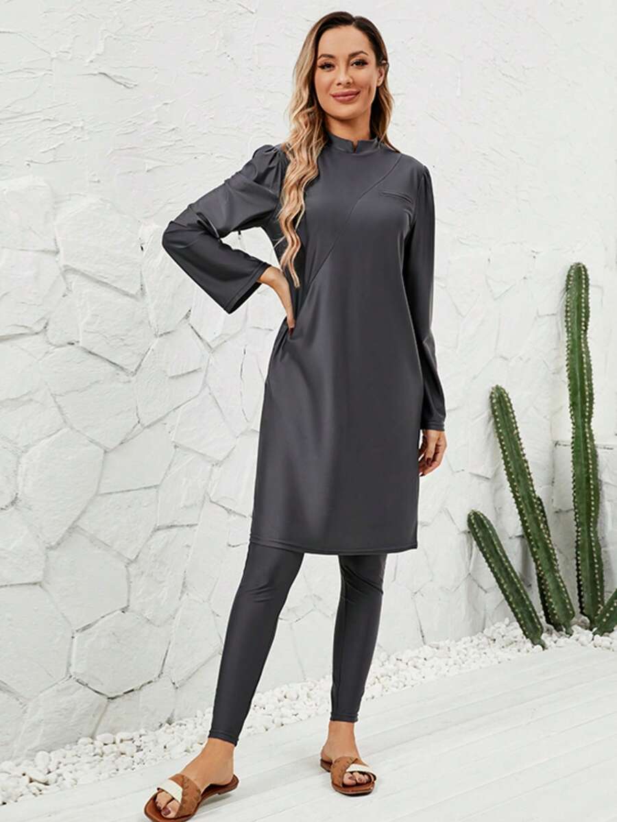 VFJ 3pcs Muslim Women High Waist Elastic Fabric Modest Swimsuit Set With Neon Green Trim, Full Coverage