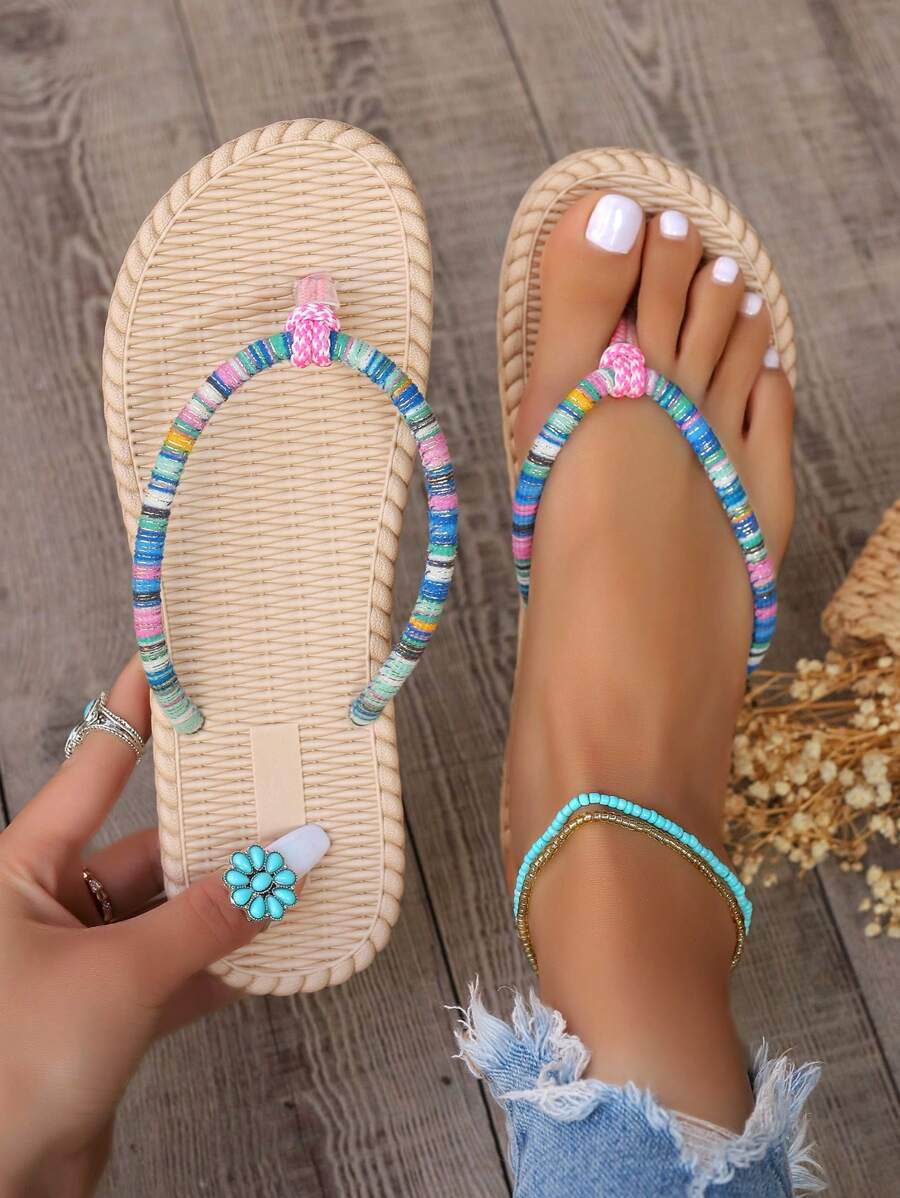 • WRCVS Blue Women's Flat Sandals, Lightweight & Comfortable, Vacation Beach Slippers With Breathable Faux Rope Sole, Bohemian Style, Foam Bottom Ultra-Light Shoes - Multicolor - View 2
