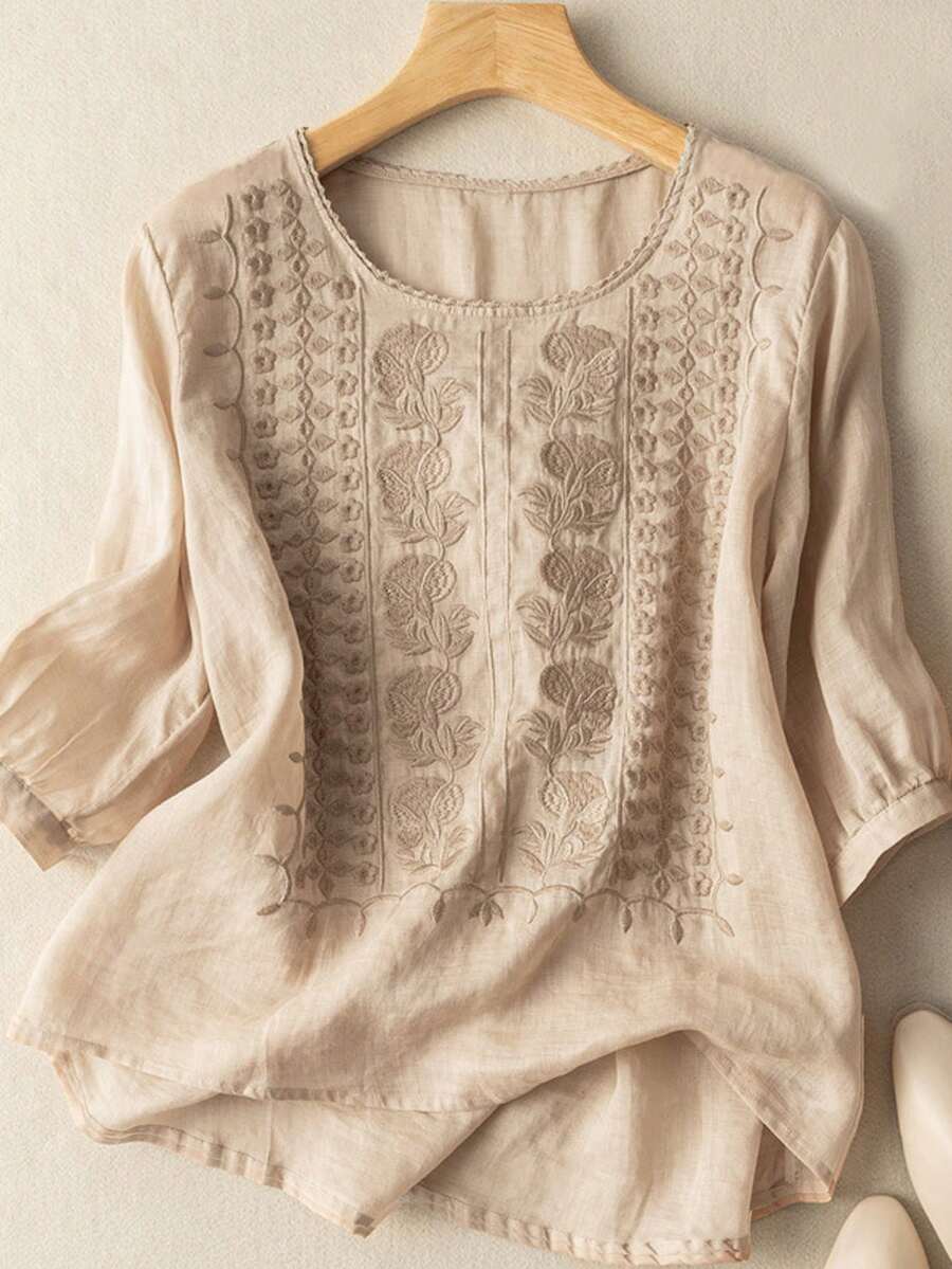 Women's Floral Embroidery Round Neck Lantern Sleeve Loose Blouse, Spring/Summer