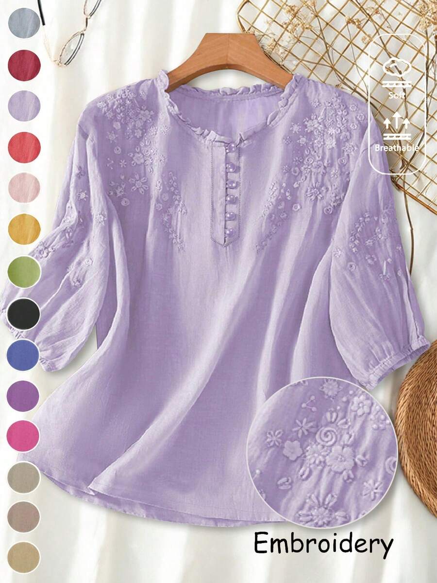 Women's Spring/Summer Embroidered Loose Retro Boho Mid-Sleeve Blouse