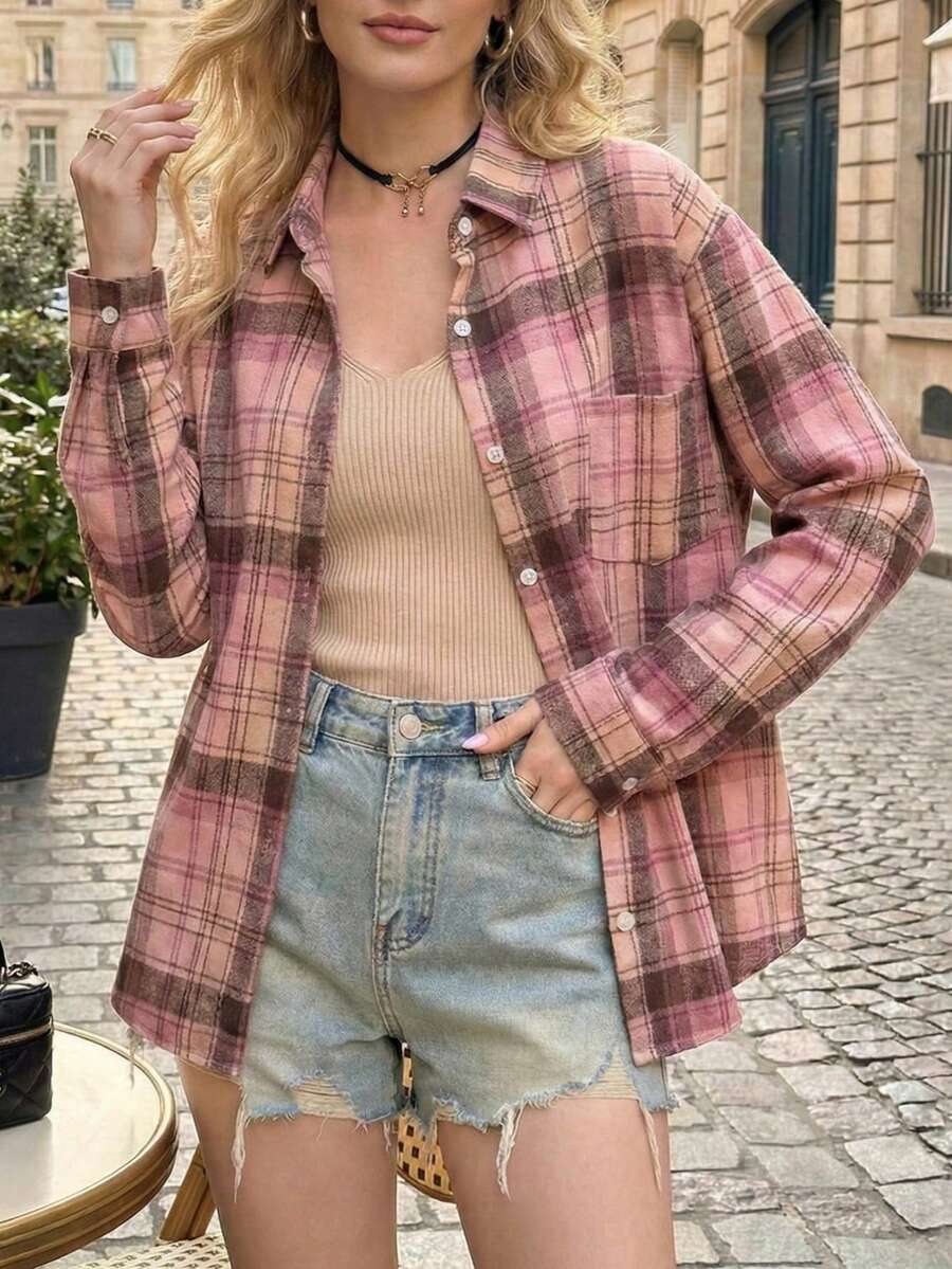 YUXIN Pink Plaid Women Long Sleeve Loose Casual Shirt Top With Pockets, Spring/Summer