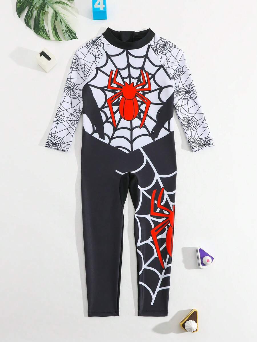 Young BoySpider Print Long Sleeve Zipper One-Piece Swimsuit, Boys' One-Piece Swimwear, Beach Holiday Swimsuit