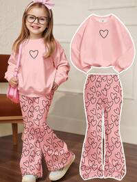 HappikinsSHEIN Bộ đồ Happikins màu hồng nhạt, họa tiết trái tim tối giản dễ thương, gồm áo nỉ dài tay cổ tròn dày dặn, mềm mại, ấm áp và quần ống loe cho bé gái, thích hợp mặc hàng ngày, ở nhà, đi học, chụp ảnh đường phố, mùa ấm áp, trang phục mùa thu đông, thoải mái dễ chịu, lớp áo mùa thu đông cho bé gái, phong cách thời trang, trang phục thường ngày, quần áo trẻ em có họa tiết, trang phục mùa thu đông, thời trang thu đông sành điệu, phong cách mới, dự tiệc, thời trang mùa đông.