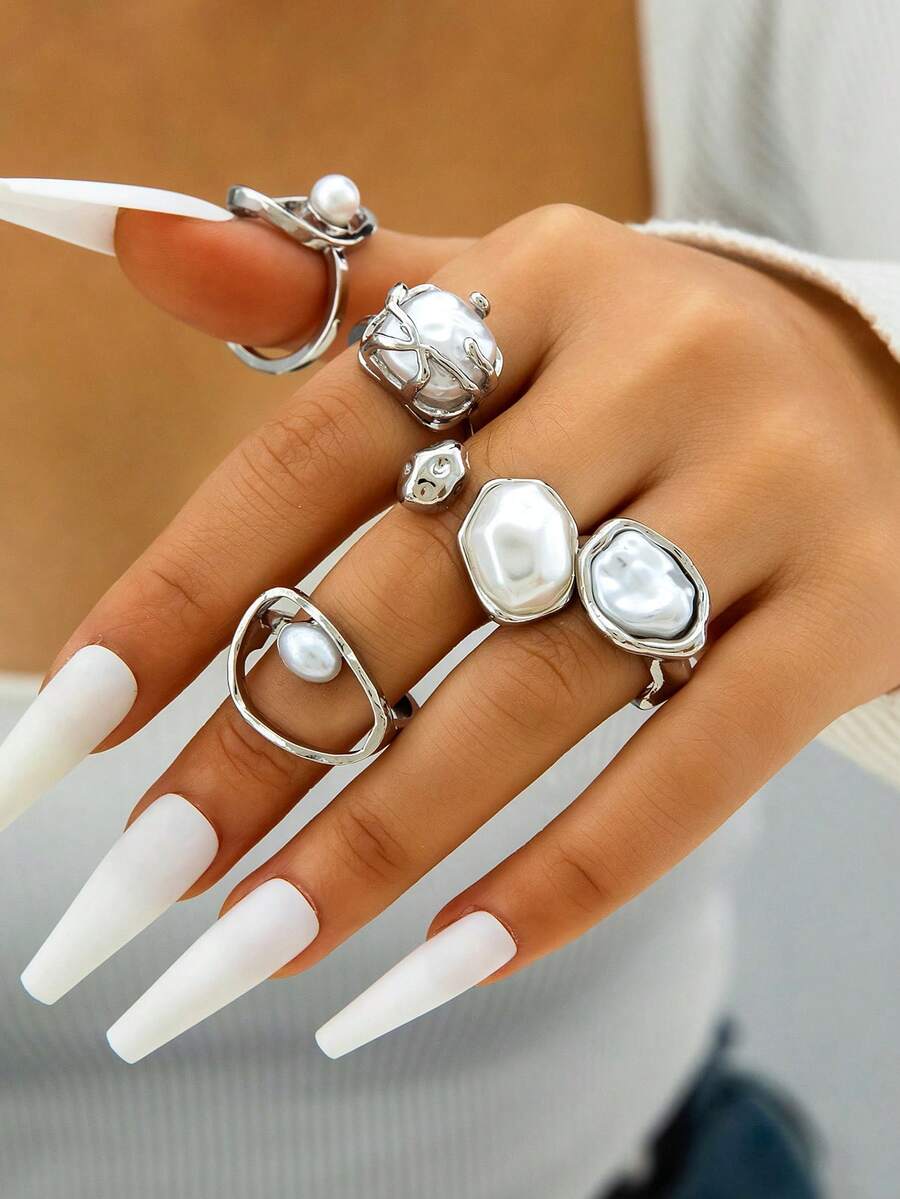 imoli 5pcs/Set Minimalist Chic Alloy Geometric Faux Pearl Inlaid Unique Design Women Jewelry Ring Set, Suitable For All Seasons Wear, Dating, Party, Gift