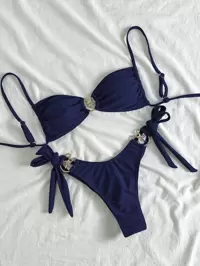 Swim Mod Women's Solid Color Jacquard Fabric Ruffled Strap Tie Bikini Set Two-Piece Swimwear, Summer