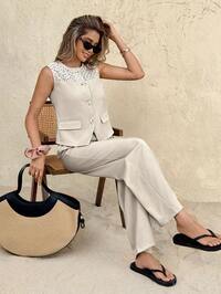 FirerieFirerie Women Elegant Commute Chic Waist Cinched Double Breasted Vest Top Two-Piece Set,Double-Breasted Blouse & High Waist Pleated Wide Leg Pants Two-Piece Set, Office Two-Piece Set, Apricot Color, Suitable For Spring/Summer,Concert,Business,Casual Woman,Wedding,Work/Office,Daily